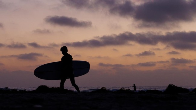 California - Di Cardiff Beach, langit senja menyapa pengunjung dengan warna jingga. Mereka menikmati momen damai di ujung hari.