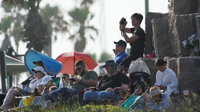 Peluncuran kesembilan roket Starship oleh SpaceX menarik perhatian ribuan pengunjung ke South Padre Island, Texas, Selasa (27/5/2025). Mereka berkumpul di berbagai titik strategis, seperti Isla Blanca Park, untuk menyaksikan momen bersejarah ini. (REUTERS/Gabriel V. Cardenas)