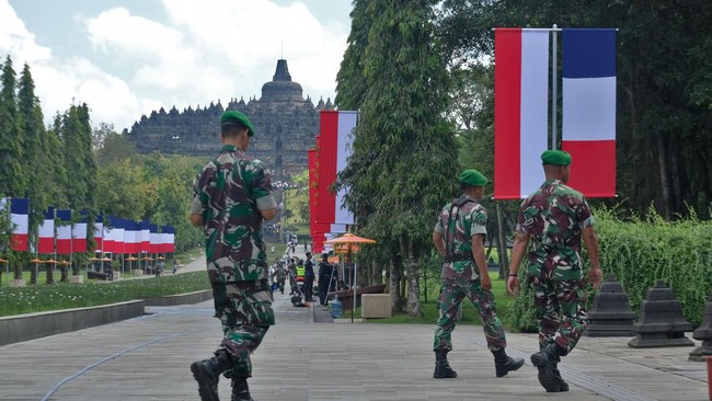 Magelang - Kawasan Borobudur dipenuhi bendera RI dan Prancis jelang kunjungan kenegaraan. Macron dan Prabowo dijadwalkan hadir di Borobudur dan Akmil pada 29 Mei.