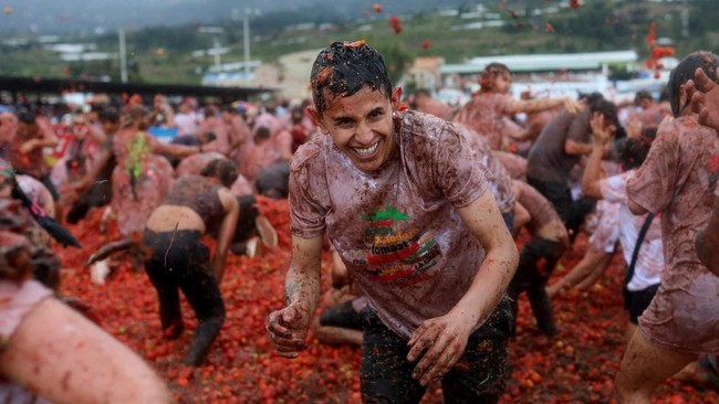 Kolombia - Ribuan orang berkumpul di Sutamarchn, Kolombia, untuk merayakan Gran Tomatina 2025. Festival ini menandai akhir panen dengan perang tomat yang meriah.