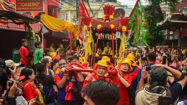 Jakarta - Sebanyak 28 tandu dewa diarak dalam kirab Gotong Toa Pe Kong di Glodok. Tradisi ini jadi bentuk syukur dan doa keselamatan warga keturunan Tionghoa.