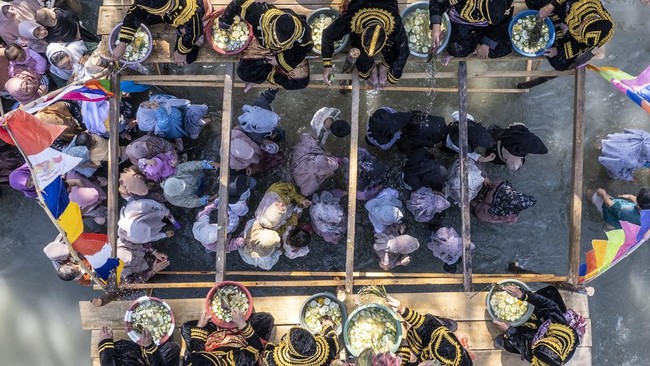 Jambi - Tradisi Mandi Balimau kembali digelar di Sungai Batang Merao, Jambi. Ribuan warga turut serta sebagai simbol penyucian diri jelang Kenduri Sko.