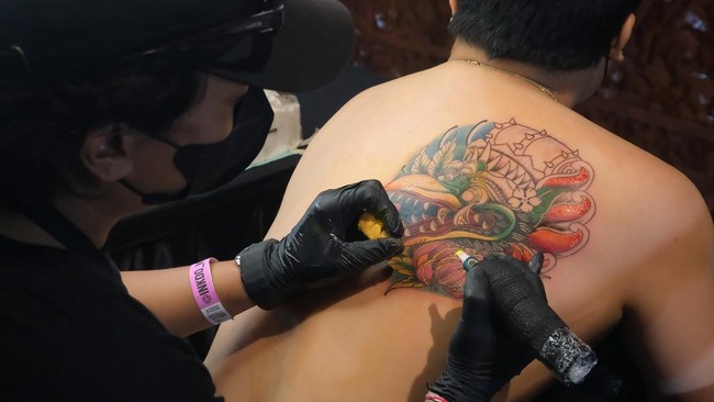 Seniman tato merajah punggung peserta saat kontes tato pada Denpasar Tattoo Fest 2025 di Gedung Dharma Negara Alaya, Denpasar, Bali, Jumat (27/6/2025). Foto: ANTARA FOTO/NYOMAN HENDRA WIBOWO