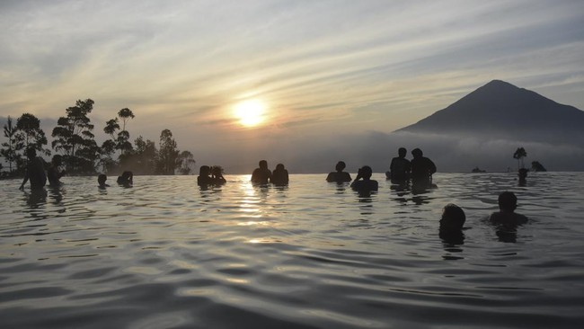 Garut - Wisata Tepas Papandayan Garut tawarkan kolam air hangat alami. Pengunjung bisa berendam sambil menikmati sunrise Gunung Cikuray yang indah.