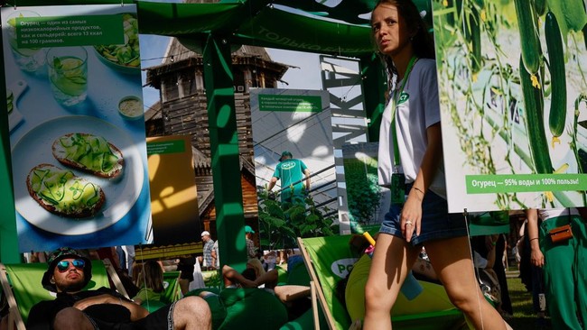 Pengunjung bersantai saat Cucumber Day di Suzdal, Rusia, Sabtu (19/7/2025). Festival ini dirayakan setiap tahun di Museum Arsitektur Kayu. (REUTERS/Yulia Morozova)