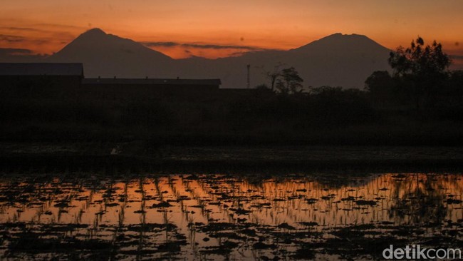 Klaten - Senja kemarau menyingkap siluet megah Merapi dan Merbabu dari Klaten dan Solo. Menghadirkan panorama langka yang memikat mata.
