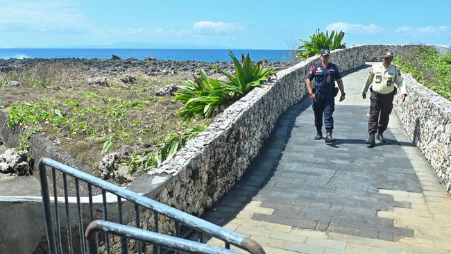 Petugas keamanan berjaga di Daya Tarik Wisata (DTW) Waterblow, The Nusa Dua, Badung, Bali, Kamis (7/8/2025). ANTARA FOTO/FIKRI YUSUF