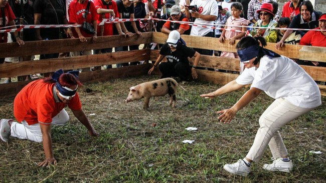 Peserta lomba mencoba menangkap anak babi dengan mata tertutup saat perayaan HUT ke-80 RI di Palangka Raya, Kalimantan Tengah, Sabtu (16/8/2025). Foto: ANTARA FOTO/Auliya Rahman