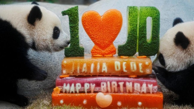 Hong Kong - Ocean Park Hong Kong merayakan ulang tahun pertama panda kembar Jia Jia dan De De dengan kue istimewa. Kehadiran keduanya jadi simbol persatuan dan kemakmuran.