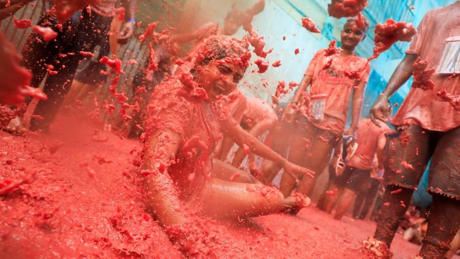 Spanyol - Ribuan orang tumpah ruah di kota Bunol, Spanyol, dalam Festival La Tomatina. Warga dan turis saling melempar tomat dalam perang makanan terbesar di dunia.