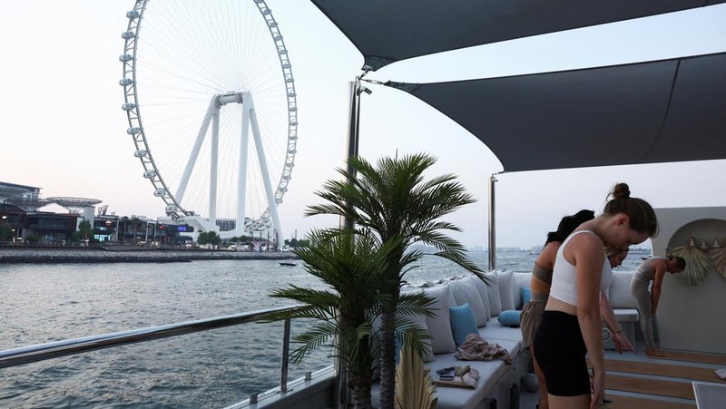Orang-orang mengikuti kelas pilates di atas kapal pesiar dengan latar belakang bianglala Ain, di Dubai, Uni Emirat Arab. Foto: REUTERS/Amr Alfiky.