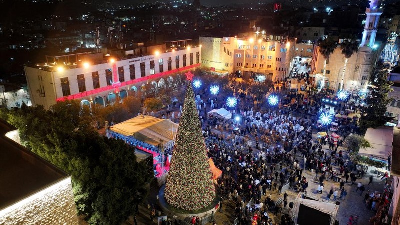 Pohon Natal setinggi puluhan meter memancarkan cahaya warna-warni di pusat kota Betlehem. Warga dan wisatawan berkumpul untuk merayakan kembalinya suasana meriah setelah dua tahun perayaan yang lebih sepi. REUTERS/Mussa Qawasma