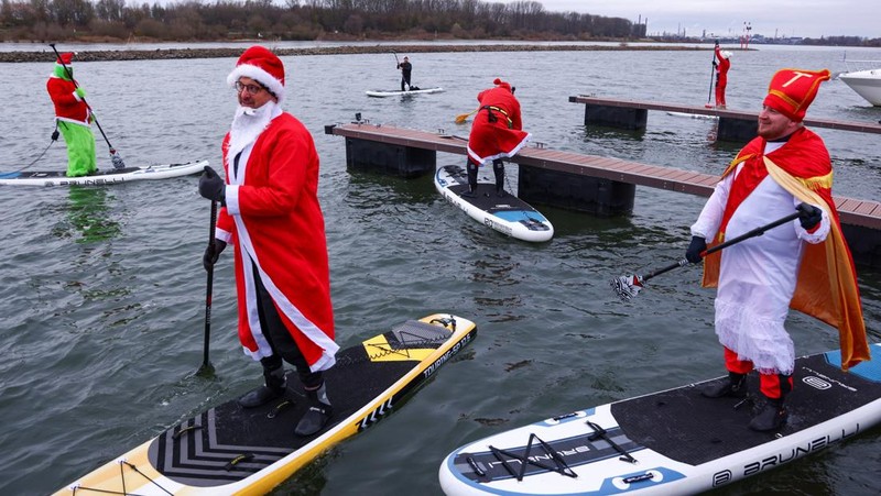 Para peserta berkostum Sinterklas memulai perjalanan mereka di Sungai Rhine, menandai dimulainya acara dayung berdiri tahunan Klub Olahraga Air Monheim di Jerman. REUTERS/Thilo Schmuelgen