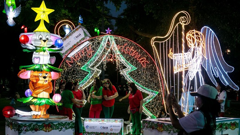 Warga berfoto dengan latar belakang dekorasi hiasan lampion bertema Natal di kawasan Balai Kota, Solo, Jawa Tengah, Senin (15/12/2025). ANTARA FOTO /MOHAMMAD AYUDHA