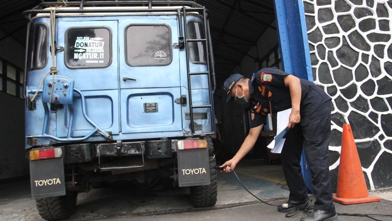 Petugas Dinas Perhubungan melakukan uji emisi jip wisata saat uji kelayakan kendaraan di Balai Uji Kendaraan Karanglo, Malang, Jawa Timur, Jumat (19/12/2025). Foto: ANTARA FOTO/Ari Bowo Sucipto
