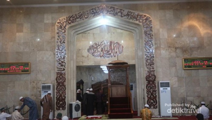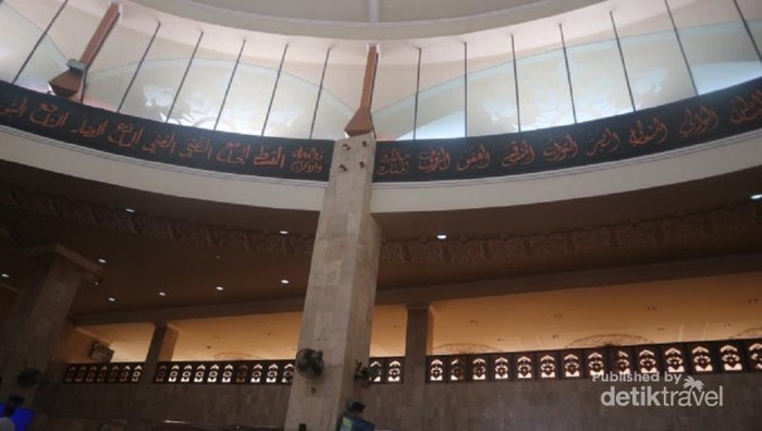 Terukir kaligrafi Asmaul Husna dan nama-nama kalifah besar yang menghiasi bagian dalam Masjid.