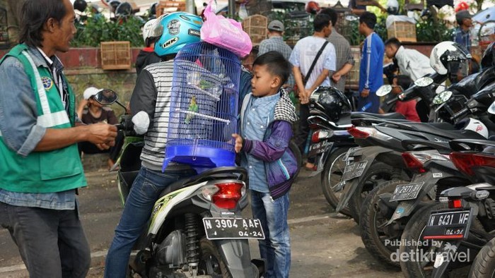Seorang anak Tampak dengan semangat membawa burung dalam sangkar yang baru saja dibeli di pasar Splendid ini. (Foto: Aryasuta)