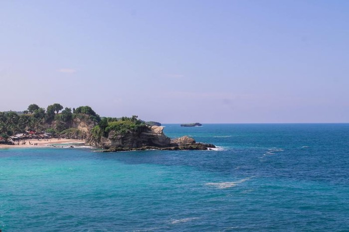 Pemandangan Pantai Klayar dari kejauhan, birunya langit dan lautan membuat mata terpana.