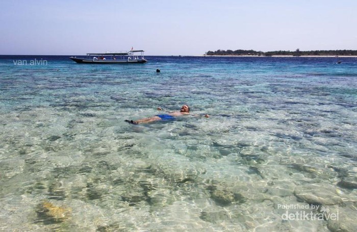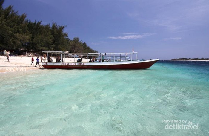 Pantai jernih nan indah ini berada di Gili Trawangan. Saking jernihnya, wisatawan dapat melihat karang di dasar laut saat berdiri di tepi pantainya.