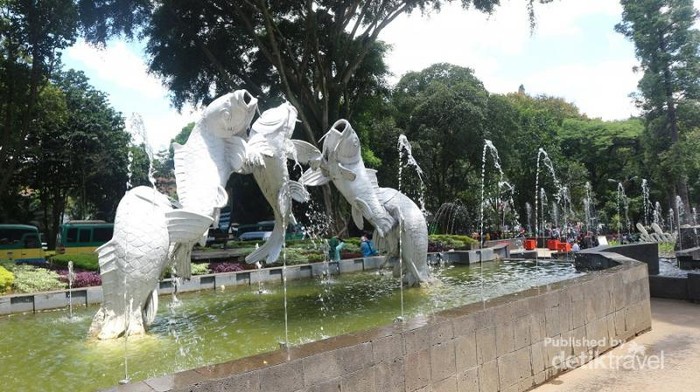 Terdapat patung ikan mas yang cukup ikonik di taman ini