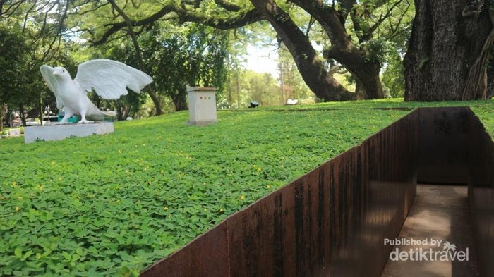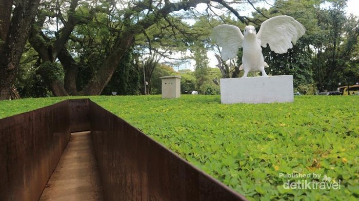 Karena dulunya adalah Taman Merpati, maka banyak patung burung merpati yang tersebar di taman ini