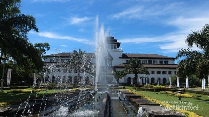 Halaman depan Gedung Sate dihiasi dengan taman yang indah dan air mancur yang cantik