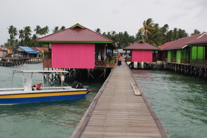 Penginapan di Pulau Derawan , dengan warna ceria dan terletak diatas air , sehingga kita dapat mendengar debur ombak saat berangkat tidur dan sesekali melihat penyu melintas.