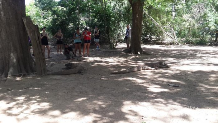 Komodo yang sedang bermalas-malasan, moment ini tidak disia-siakan oleh para turis untuk mengambil gambarnya
