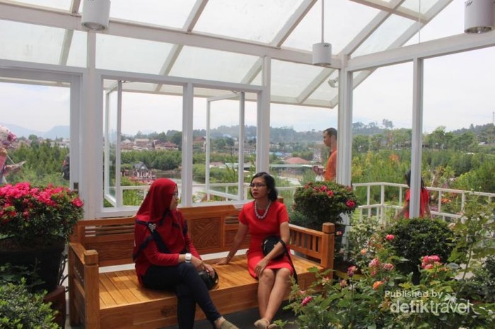 Pemandangan di rumah kaca dengan bunga dan juga bangku yang membuat betah pengunjung