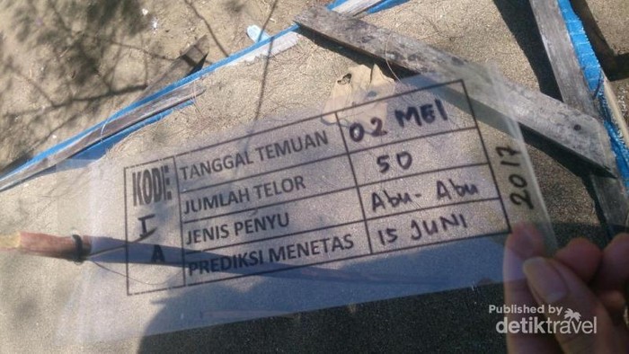 Telur penyu yang dipindah dari pantai , diberi tanggal dan data lain untuk memudahkan pengamatan.