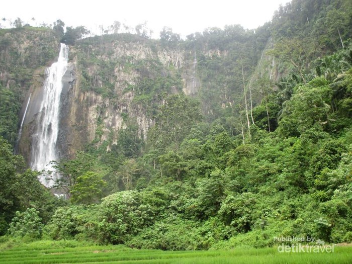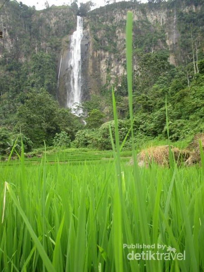 Namun selain keindahannya tadi, masih ada satu keunikan air terjun ini, yaitu adanya persawahan hijau yang menjadi latar air terjun ini. Sebuah pemandangan yang jarang saya lihat di air terjun lain
