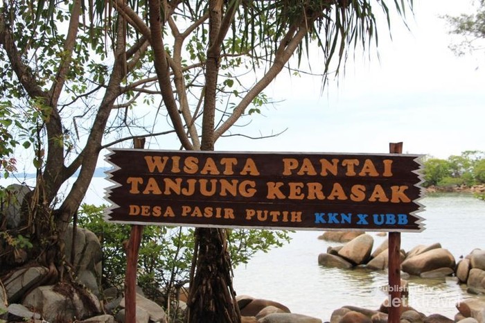 Papan nama Pantai Tanjung Kerasak yang dibuat oleh mahasiswa UBB pada saat Kuliah Kerja Nyata