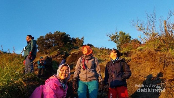 Sela menikmati sunrise menuju summit Rinjani. Kami membiarkan sinar matahari menjamah di wajah dan badan kami