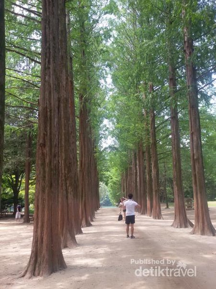 Deretan pohon pinus di Nami Island yang menjadi tempat favorit bagi traveler untuk berfoto
