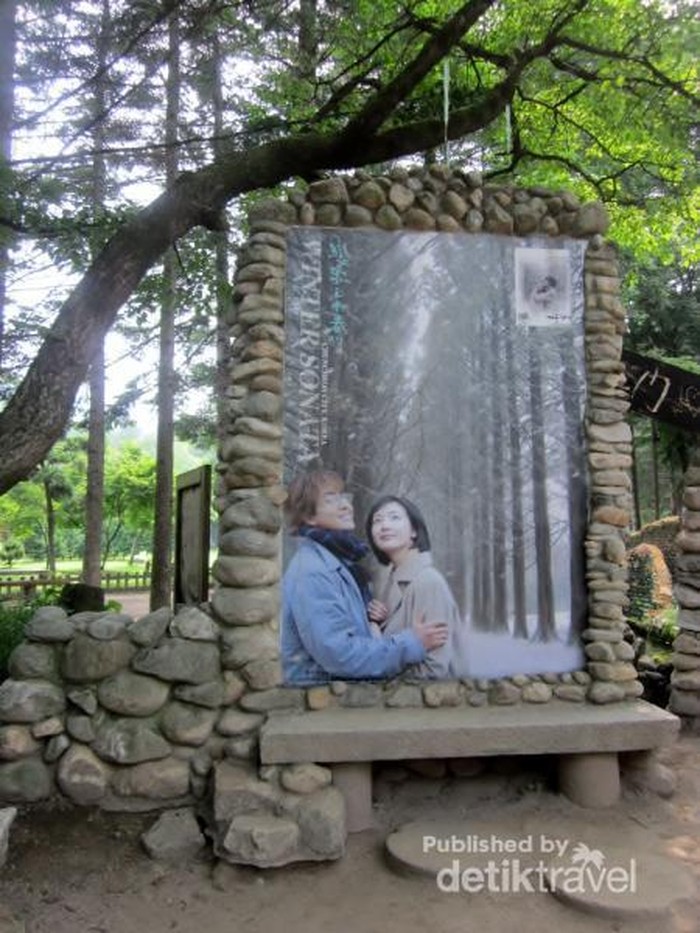 Salah satu sudut favorit traveler untuk berfoto di Nami Island, di mana traveler dapat berfoto dengan latar belakang poster drama korea