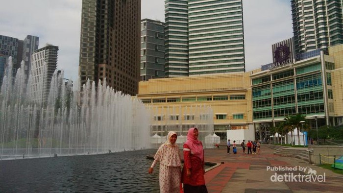 Tertawa bahagia dengan latar air mancur di Taman Menara Petronas