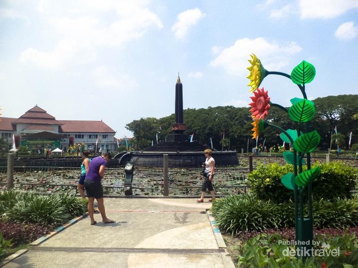 Kolam teratai yang mengelilingi tugu, di belakangnya adalah Balai Kota Malang