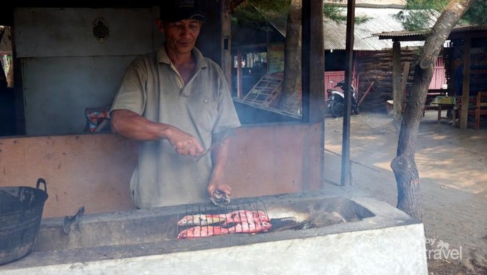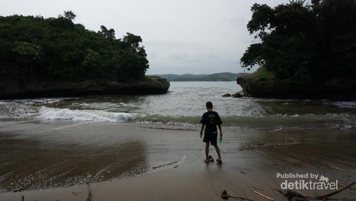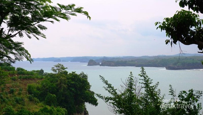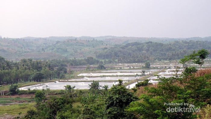 Perbukitan sisi sebelah timur, kombinasi bukit dan bebatuan. Dari kejauhan tampak seorang pencari ikan dengan kailnya