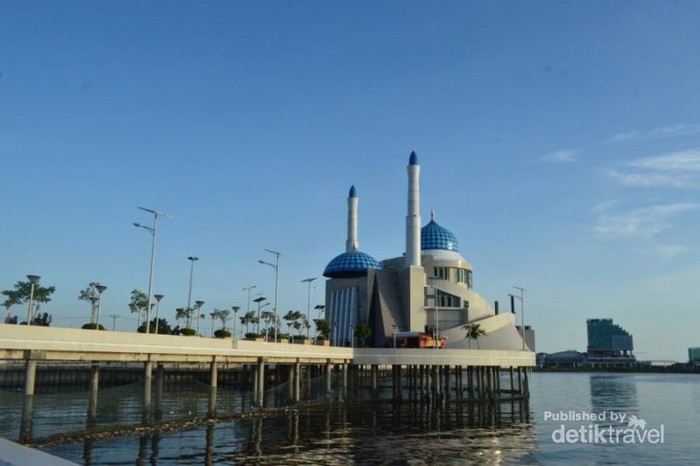 Masjid Amirul Mukminin berdiri megah menambah keindahan Pantai Losari, Makassar beberapa saat sebelum sunset.