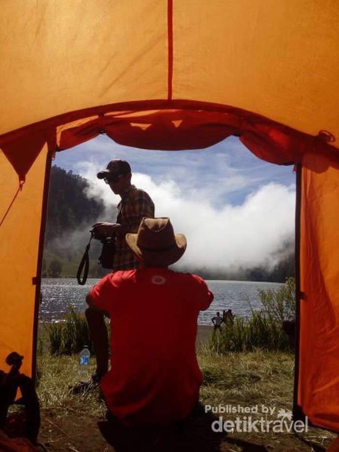 Jika kita menggelar tenda di tepian Ranu Kumbolo, kita bisa langsung menikmati keindahannya dari depan tenda.