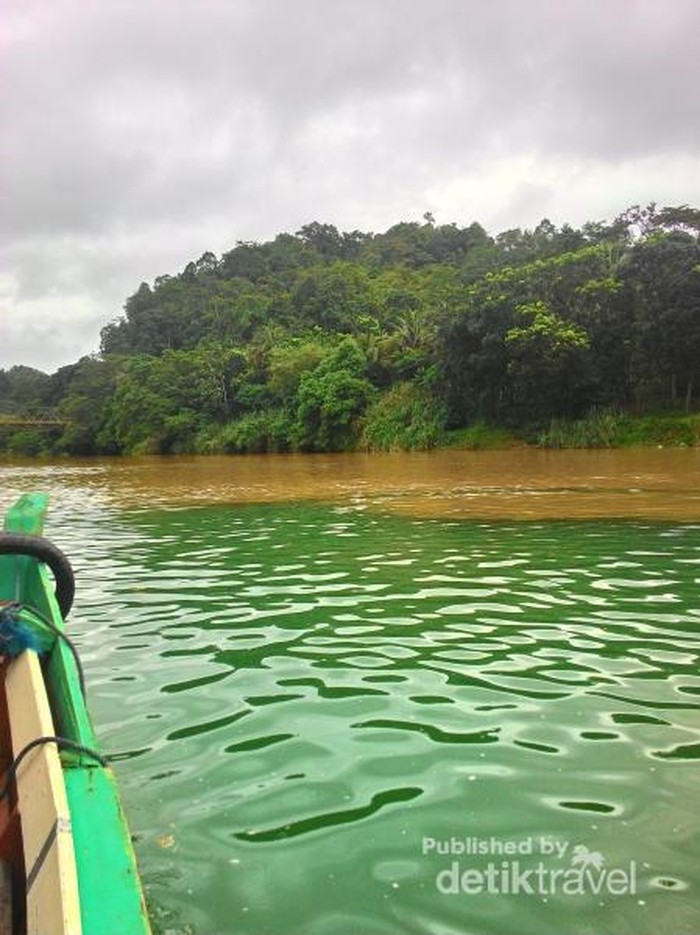 Di perjalanan menuju curug dengan perahu. Ada pemandangan unik di sungainya. Warna airnya terbagi menjadi dua.