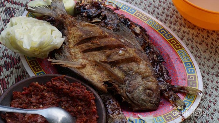 Ikan bawal dan kakap, disajikan dengan nasi hangat dan sambal. Sarapan istimewa di tepi pantai