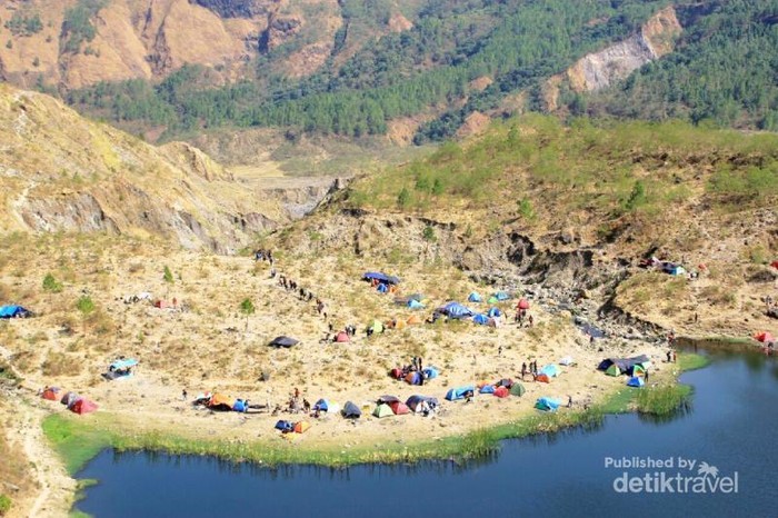 Inilah View Point dari Danau Tanralili. Puluhan tenda berwarna-warni mengitari danau. Terlihat beberapa pendaki bergerak pulang kembali ke posko. Warna air dari danau,rumput, pepohonan dan tenda menambah keindahan Danau Tanralili