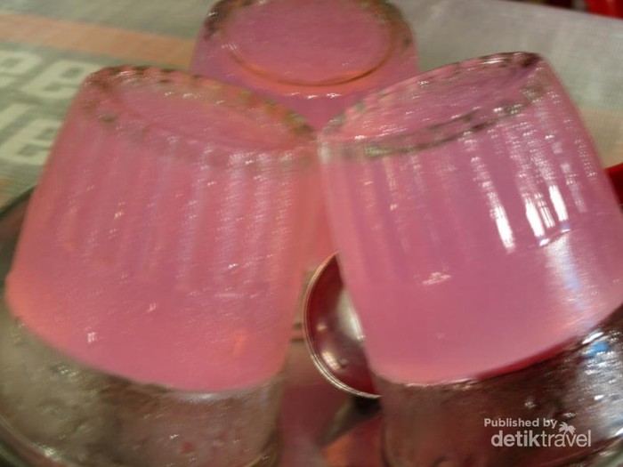 Di sini juga disediakan agar-agar dingin yang disajikan di dalam gelas terbalik sebagai pencuci mulut.