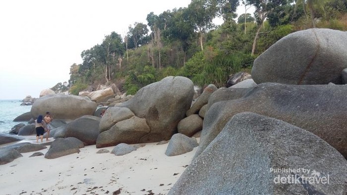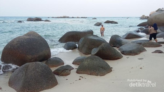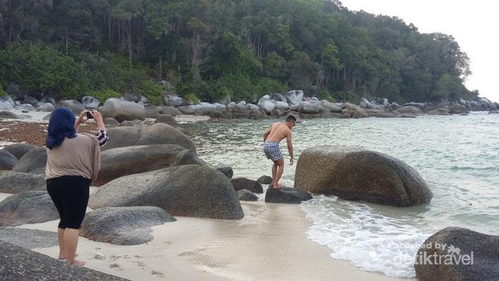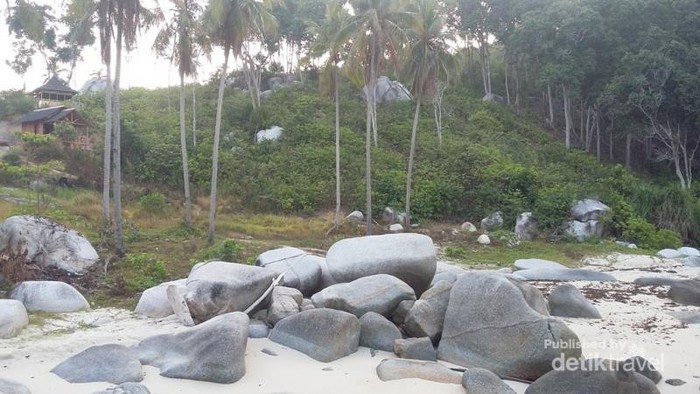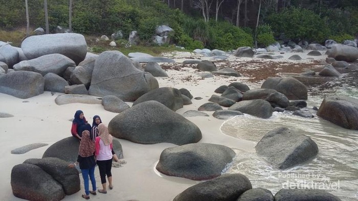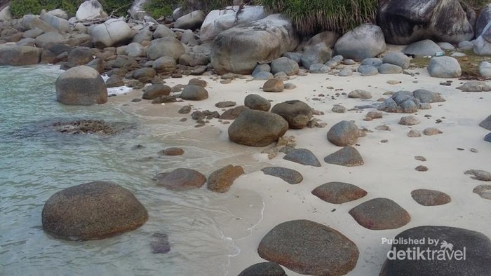 Seperti pantai di Pulau Bangka pada umumnya, di pantai ini juga bertaburan batu-batu granit dengan beragam ukuran dan rupa.