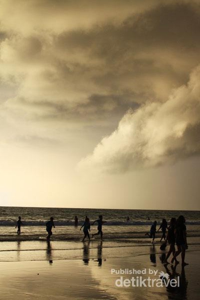 Wisatawan mulai meninggalkan pantai ketika langit semakin gelap