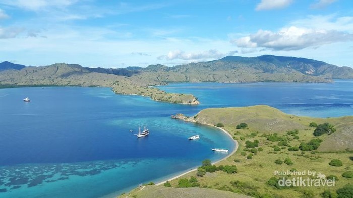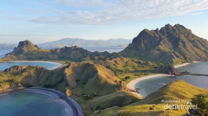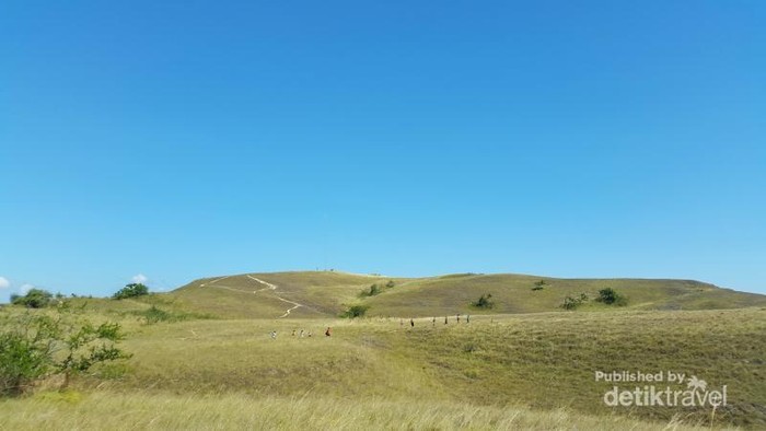 Bukit berwarna hijau berada di sisi kanan puncak Gili Lawa Darat tidak kalah indah dengan Selandia Baru