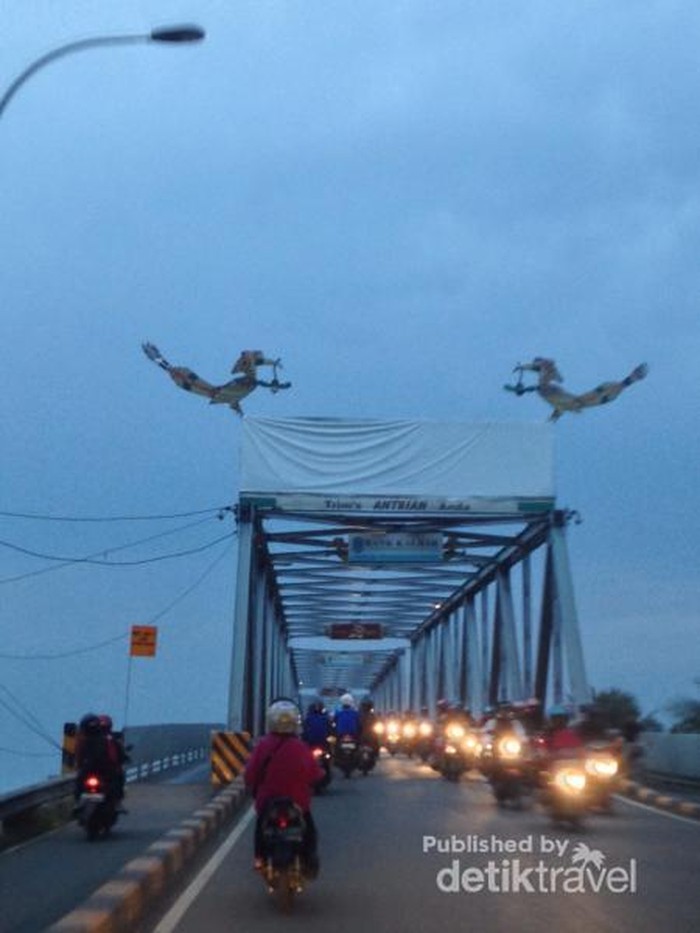 Sinar lampu motor-motor yang melewati jembatan Sungai Kapuas menambah eksotis pemandangan senja di Kota Pontianak