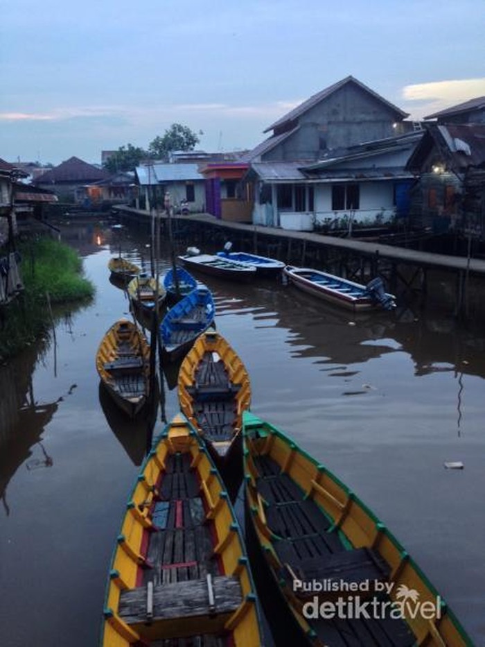 Deretan perahu masyarakat yang tinggal di tepian Sungai Kapuas, yang baru kembali dari berbagai aktivitas mereka di siang hari