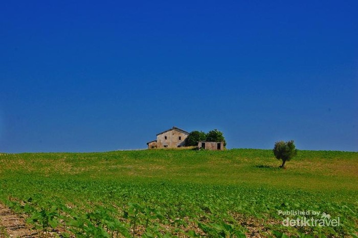 Rumah Tua ditengah ladang bunga matahari, bisa dibayangkan betapa indahnya pemandangan ini saat bunga bunga matahari sudah bermekaran. jika bisa ingin kugambar pelangi dilangit biru itu.